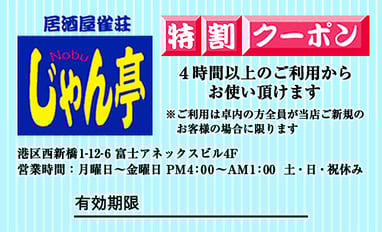 じゃん亭nobuではクーポン券(お試しクーポン:初回ご来店時のみ有効です)を発行しております!